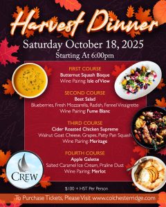 Join us at CREW Winery for a special Harvest Dinner showcasing the bounty of the season. This elegant evening features four courses highlighting local ingredients, each paired with award-winning CREW