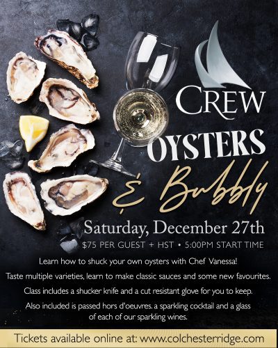 Join us at Colchester Ridge Estate Winery on Saturday, December 27 at 5:00 PM for an interactive Oysters & Bubbly class. Under Chef Vanessa’s guidance you’ll learn to shuck your own oysters, mix classic and inventive sauces, and taste several oyster varieties—all paired with a sparkling cocktail and pours of each CREW bubbly. The class fee includes a shucker knife and cut-resistant glove to take home.